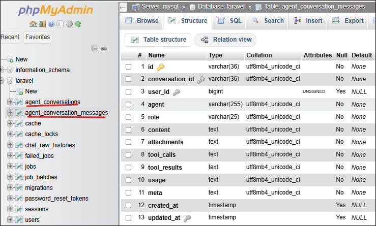 これまでは、会話履歴をDBに保存して、毎回取り出して、並び順を整えて、AIに渡し直す…というコードを自分で書く必要がありました。このLaravel AI SDKを使うと、会話履歴を自動保存してくれるデータベーステーブルが既に用意されています(マイグレーションは必要)。