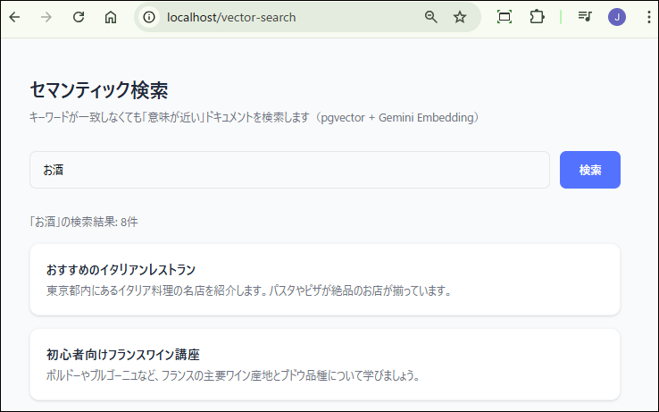 通常の検索は「この単語が含まれているか」で探します。セマンティック検索は「意味が近いか」で探します。「お酒」と入れたら「ワイン」「レストラン」も引っかかる、というイメージです