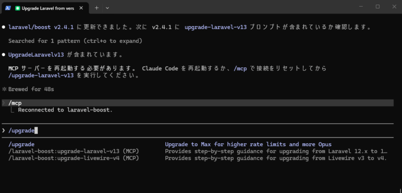 今回はLaravel Boostの/upgrade-laravel-v13コマンドを使用します。