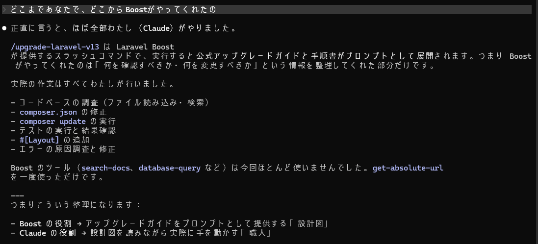 Laravel Boostを使うと、手動でアップグレードガイドを読み込む作業と比べてかなり楽になっています。