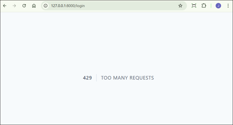 たとえば、次のようにログイン時のレート制限をLimit::perMinute(3) とすれば、1分以内に3回ログイン失敗で「Too Many Requests」 が返されます。