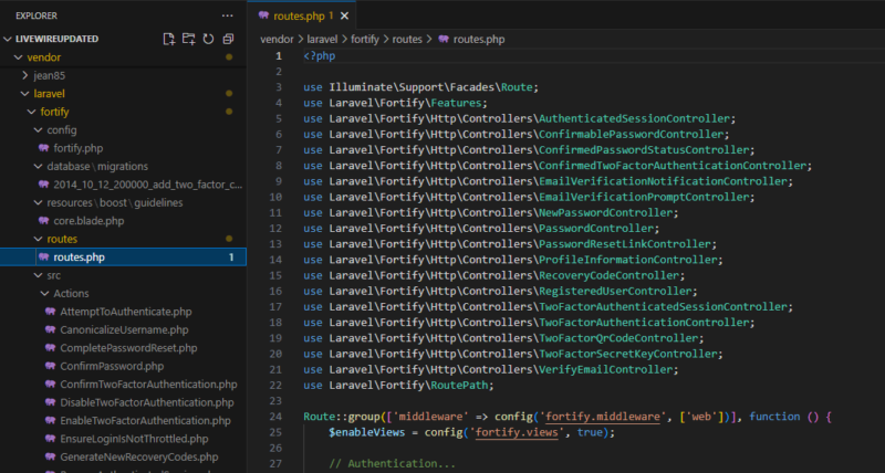 たとえばスターターキットでLivewireを選択した場合は、Livewireによって認証処理が作成されていました。変更後は、Fortifyが使われています。
