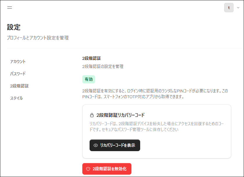 2段階認証を有効にすると、リカバリーコード(緊急用バックアップコード)が8個自動生成されます。