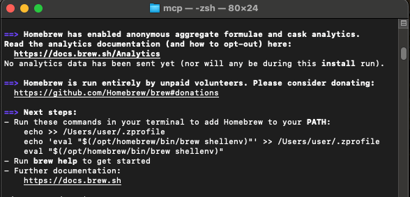 指示に従って、以下のコマンドでHomebrewのパスを通します。