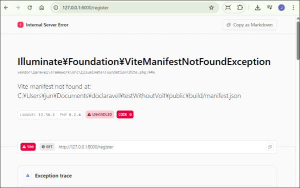 開発環境では、エラー時にエラーメッセージが表示されるようにします。
