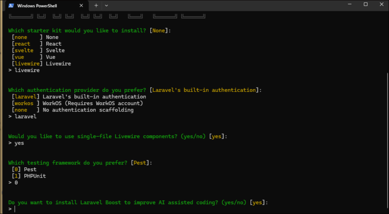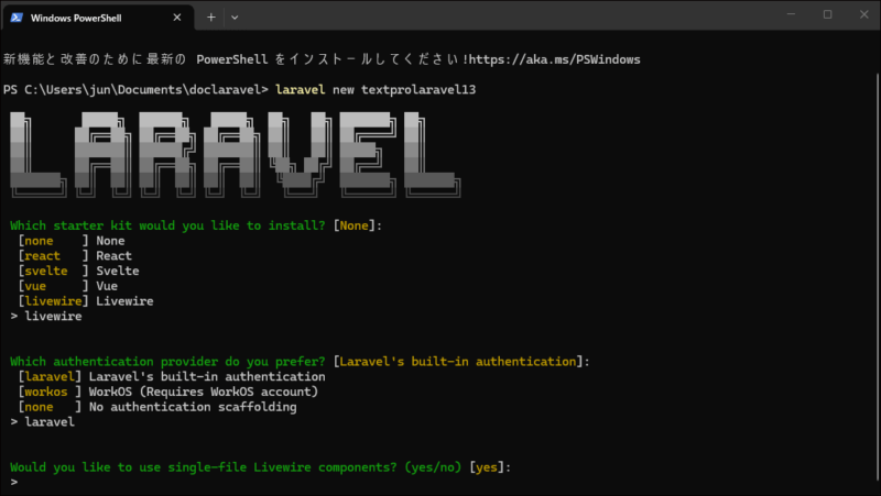 Laravelではプロジェクト選択時にスターターキットを選べますが、今回はLivewireを選択します。