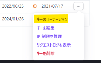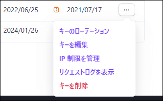 制限したいシークレットキーの行にあるオーバーフローメニュー(…)をクリック。「IP制限を管理」(Manage IP restrictions)を選択します。