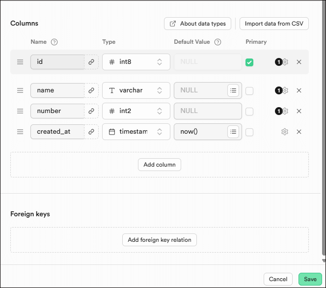 ここに「Add columns」ボタンを押して、[name]と[number]カラムを追加します。Typeはそれぞれ[varchar]と[int2]にします。