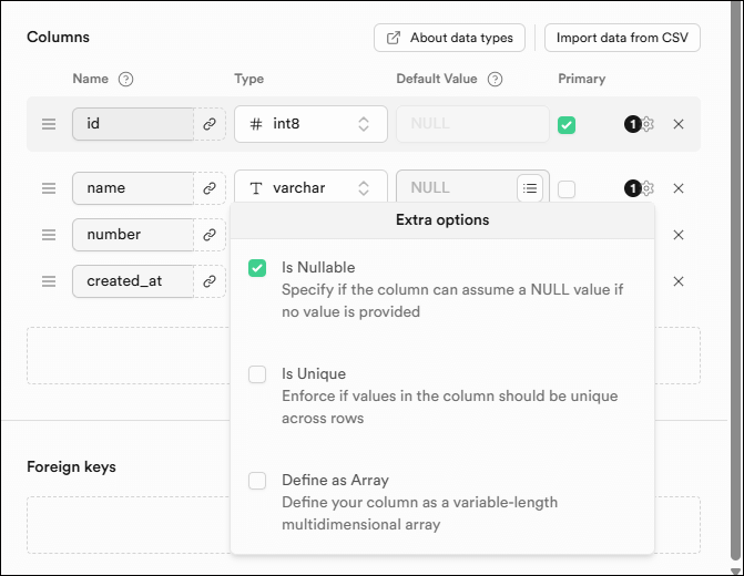 なおSupabaseでは、Null値許容かどうかなどの設定も、手軽に実施できます。デフォルトではNull値許容となっていますが、各カラムの横の歯車マークを押して、簡単に設定を変えることができます。