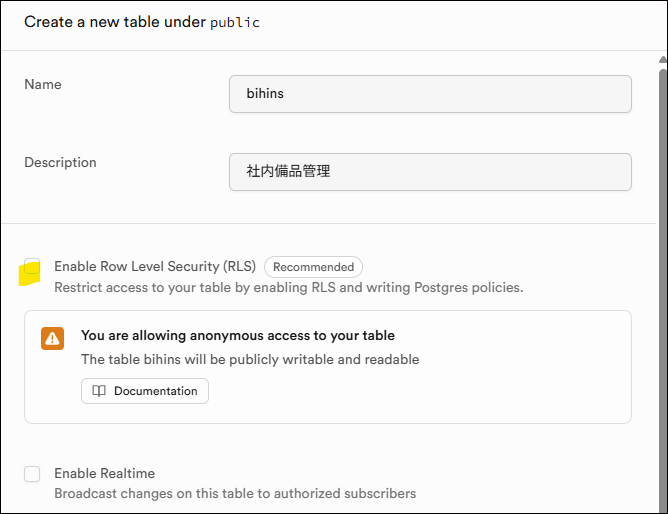 Enable Row Level Security(RLS)はデフォルトでチェックが入っています。こちらはセキュリティ上とても大事なのですが、テストの際にはここにチェックが入っているとエラーになります。テスト時には、まずはチェックを外しておきましょう。