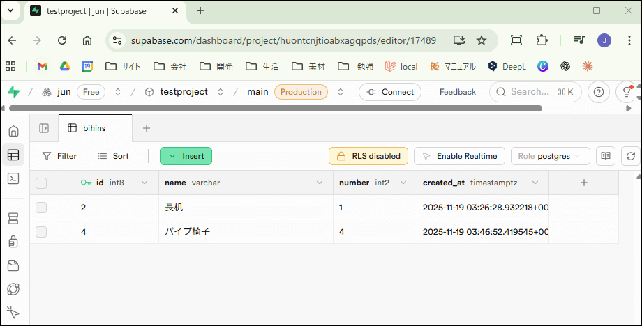 備品を新規登録したら、Supabaseのデータベースにも反映されているかチェックしてみてくださいね。