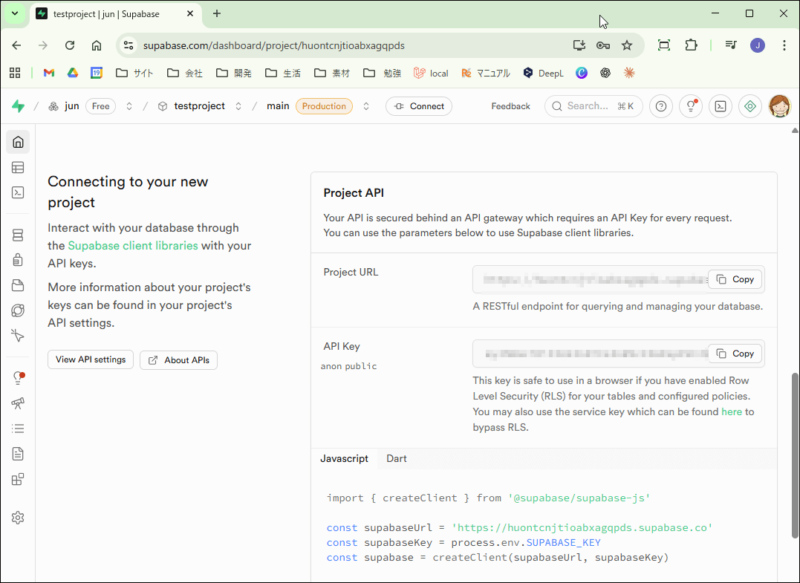 URLとKey情報は、Supabaseのプロジェクトトップ画面に記載されています。「VITE_SUPABASE_URL」には「Project API」のProject URLを、「VITE_SUPABASE_PUBLISHABLE_KEY」には、とAPI Key情報をいれます。