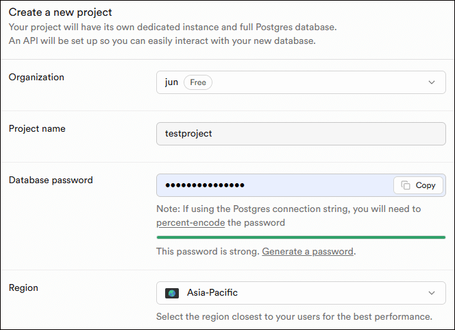 Supabase内でNew Projectをクリックして新規プロジェクトを作ります。設定はデフォルトでOKです。