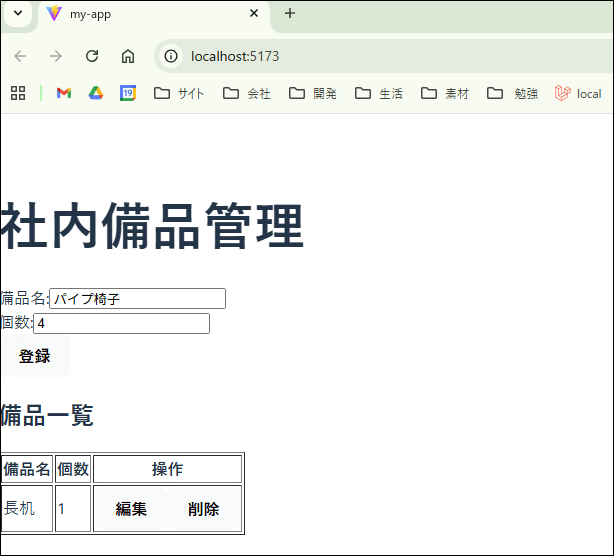 これでOKです。Webアプリを立ち上げて、連携をテストしてみてください。下記は、わたしの環境で開発した備品管理用アプリとなります。
