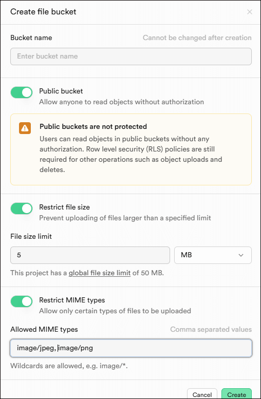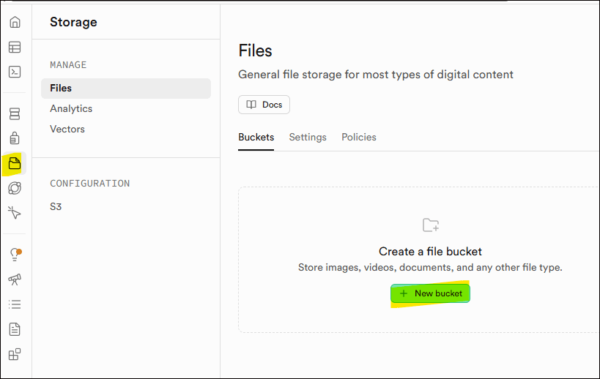 まずはSupabase側でStorageの設定を進めておきましょう。最初に、ファイルを入れる箱(Bucket・バケツ)を作ります。