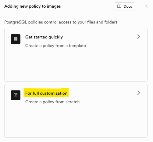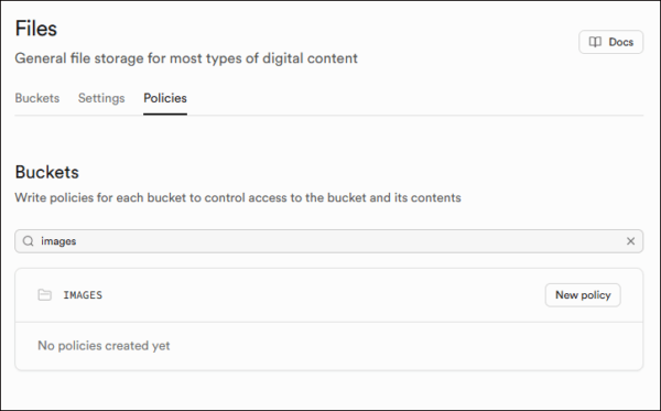 次に、Bucketのポリシーを設定します。前回はデータベースにポリシーを設定しましたが、Supabaseでは、Bucketにもポリシーを設定し、細かくアクセス制限をかけられます。