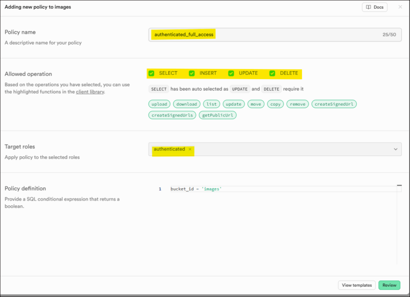- Target rolesでは、今回はauthenticatedを選択します。これで、認証ユーザーのみがすべての操作(アップロード・閲覧・更新・削除)を行えるようになります。