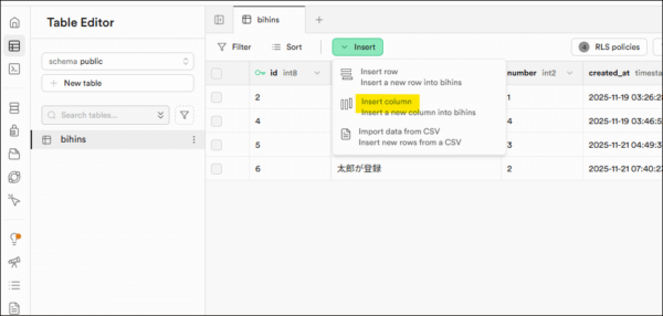 サイドバーのTable Editorより、テーブルを選びます。本記事ではbihinsテーブルを選択します。【Insert】ボタンをクリックし、Insert columnを選択します。