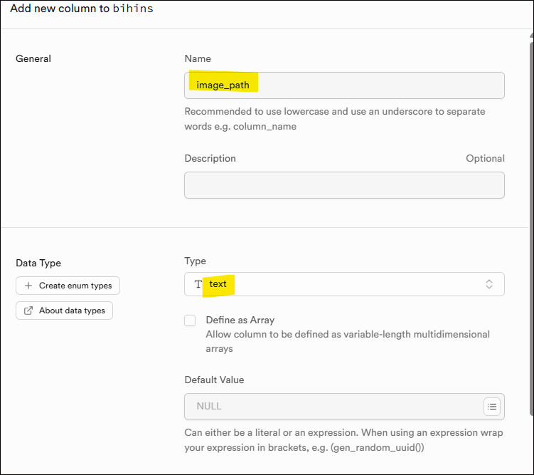 - Data Typeには、データ型をいれます。今回はtextにします。